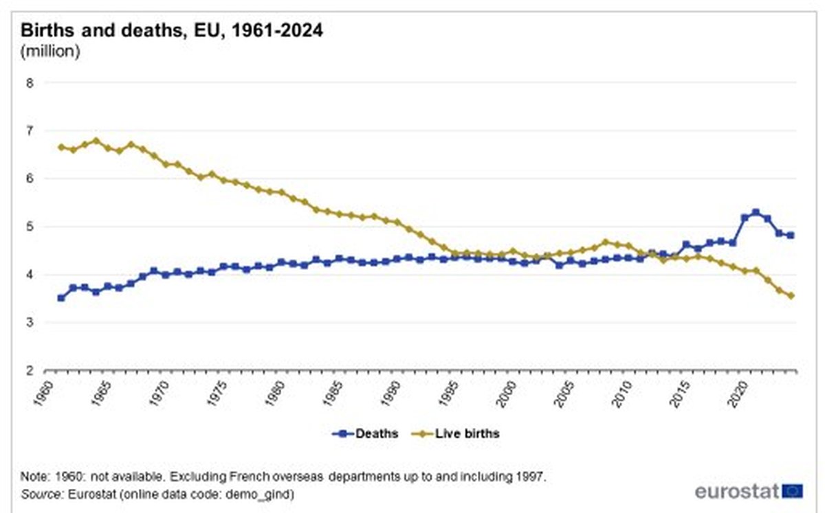 В ЕС в прошлом году число смертей превысило число рождений на ошеломляющие 1,26 миллиона человек. Впервые в истории. Если к этому тренду добавить тот, о котором я писал на днях: 41,2% школьников младших и средних классов Вены — мусульмане (в других европейских столицах похожие цифры), то становится понятным, что демографические изменения в Европе имеют необратимый характер.