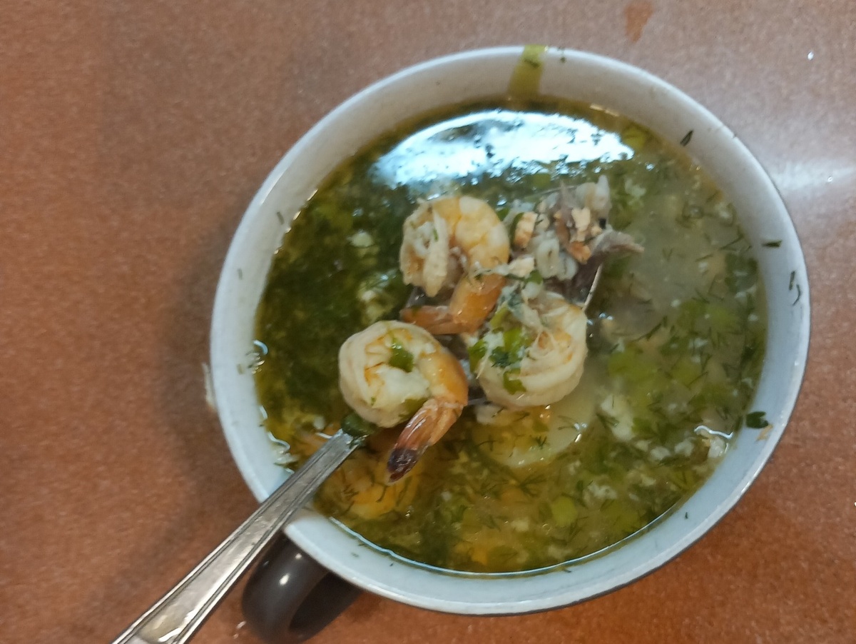 получилось много, забросил его обратно, и уха вышла в меру жирной. А кожу и жирные части я тоже выбросил и снес котам. Архиерею толстым быть некрасиво. Еще минут пять проварил и добавил креветки, целых полпакета. Их переваривать категорически не рекомендуется.